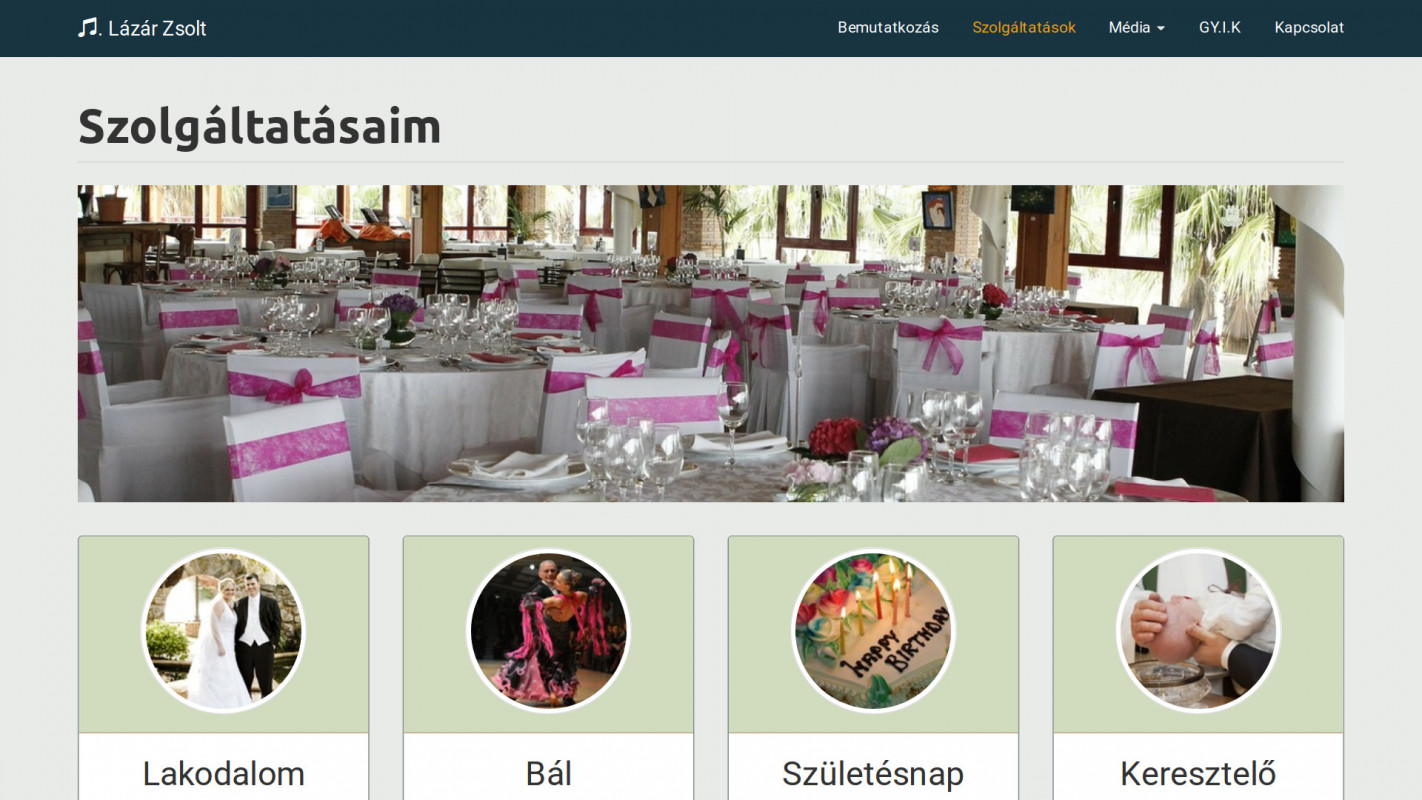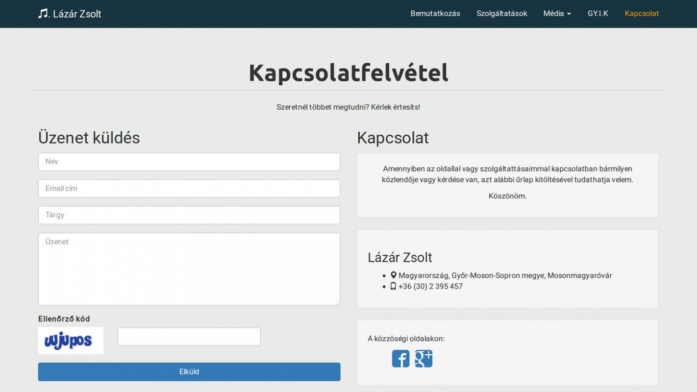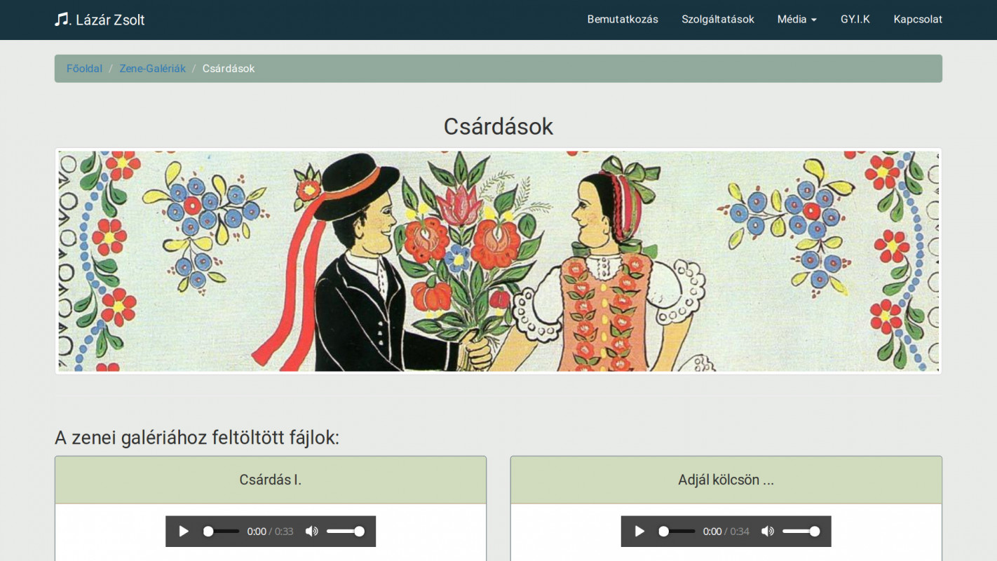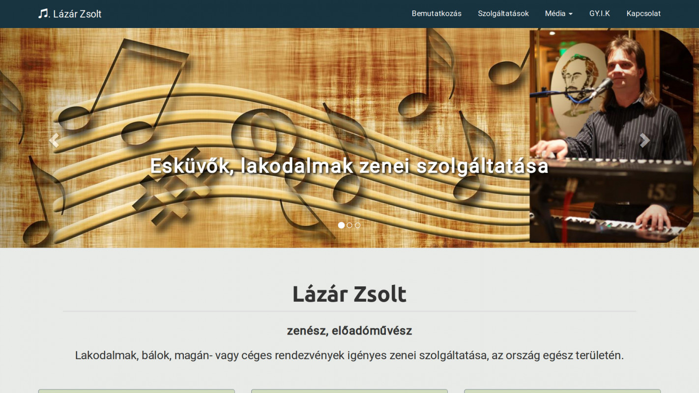 Lázár Zsolt zenész és előadóművész bemutatkozó oldala. Az oldal 2016-ban került publikálásra, néhány funkció még fejlesztés alatt van. A kialakítás során nem tartalom kezelő rendszert használtam, hanem egyedi site készült Yii keretrendszer használatával. A kialakítás magában foglalta: