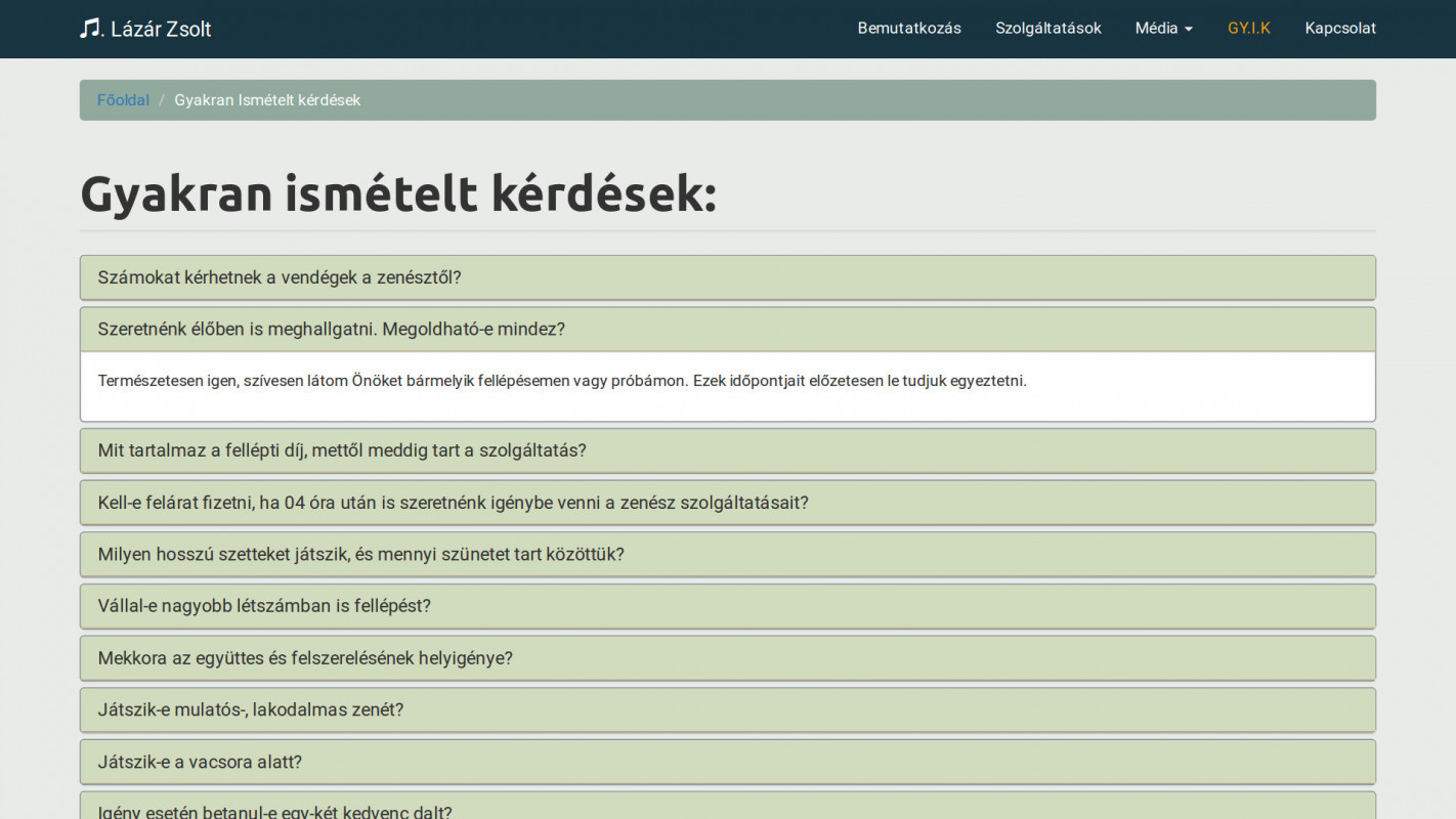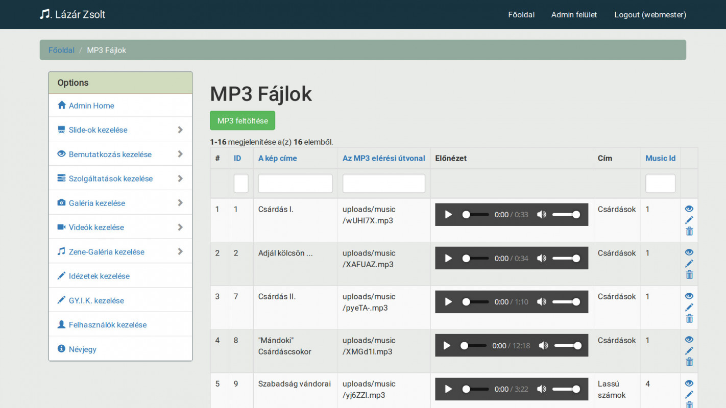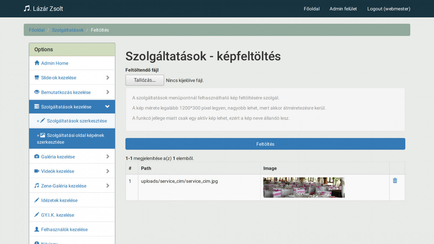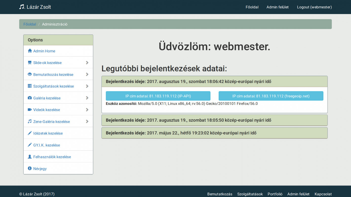 Lázár Zsolt zenész és előadóművész bemutatkozó oldala. Az oldal 2016-ban került publikálásra, néhány funkció még fejlesztés alatt van. A kialakítás során nem tartalom kezelő rendszert használtam, hanem egyedi site készült Yii keretrendszer használatával. A kialakítás magában foglalta:
